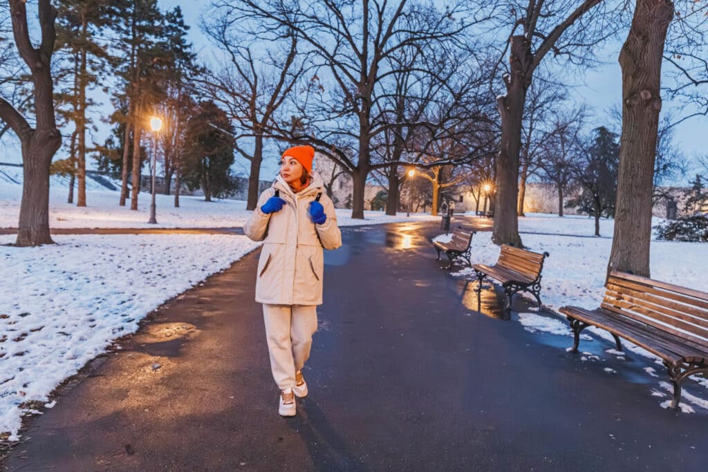 A small flashlight or headlamp helps you spot uneven pavement or puddles. If you’re walking a dog, give them a reflective leash or collar light too.